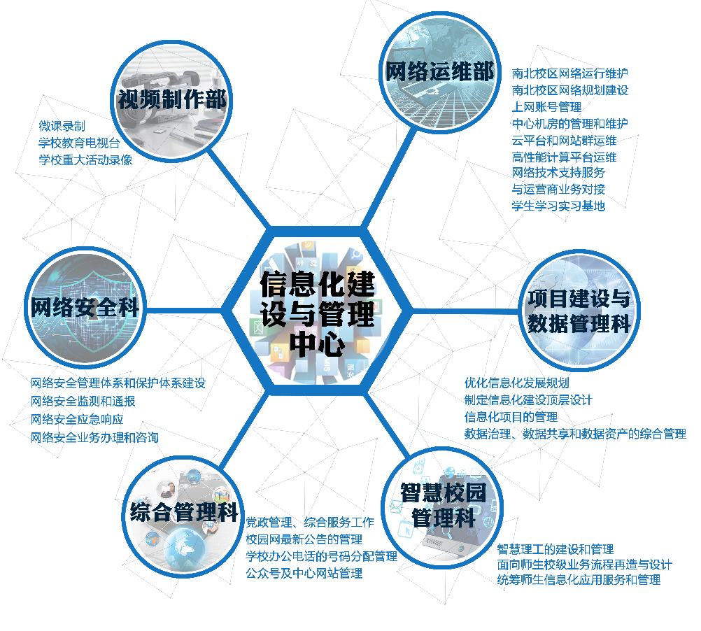 中心下设综合科、网络安全科、智慧校园管理科、网络运维部、项目建设与数据管理科、智慧教学视频制作部等6个科(部)室。
